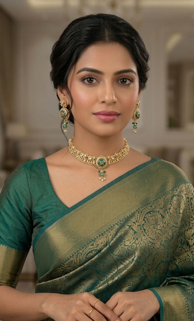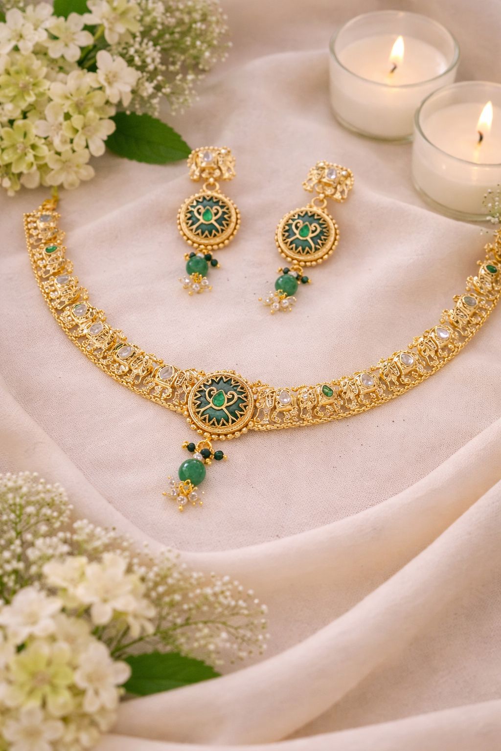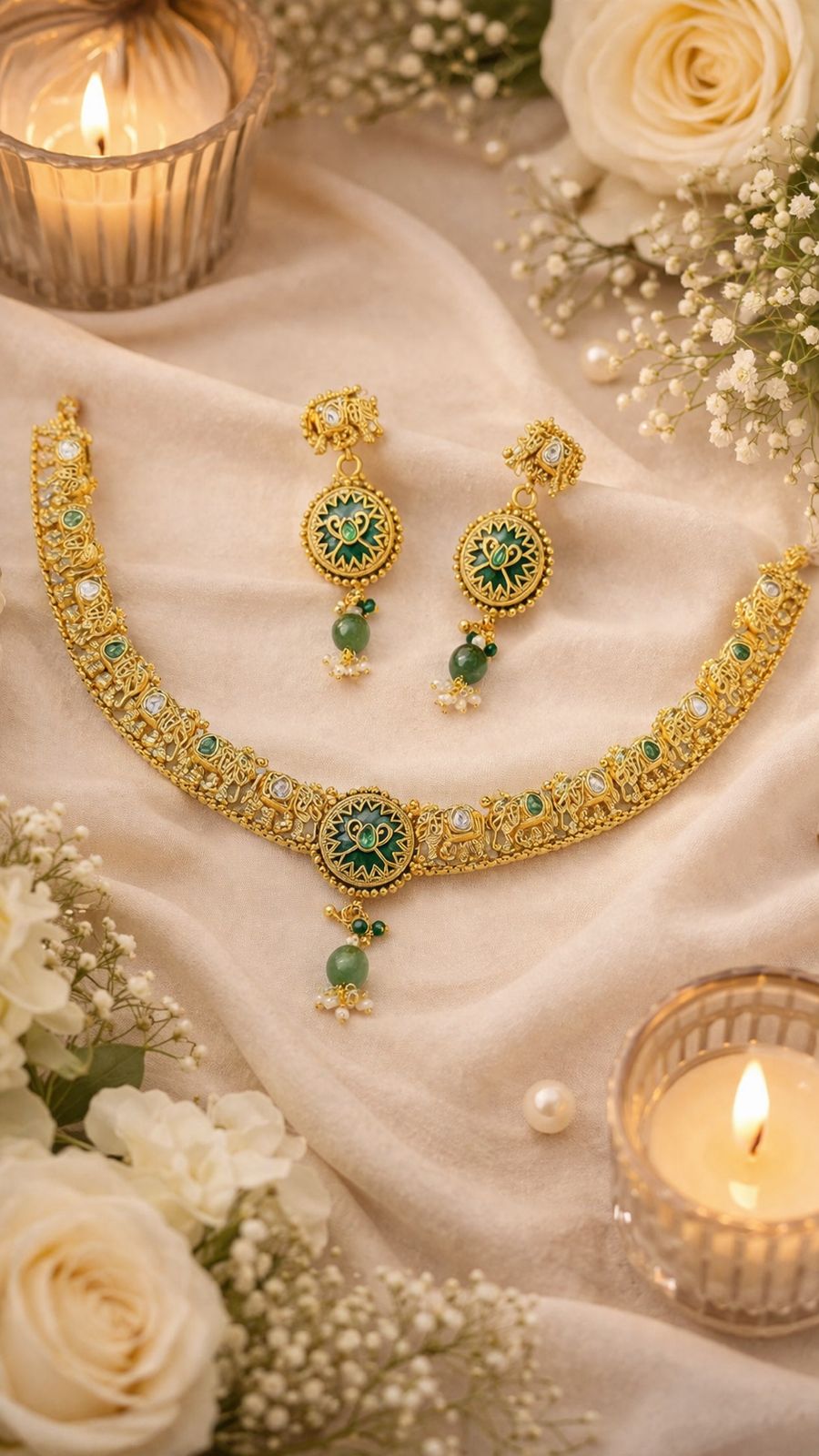 A timeless heritage set adorned with delicate elephant motifs, symbolizing royal grace and tradition. Crafted with intricate detailing, it beautifully reflects vintage charm with a regal touch. The soft off-tone hue adds subtle elegance, making it perfect for both festive and wedding looks. Lightweight yet statement-worthy, it’s designed to elevate your style with effortless sophistication. ✨